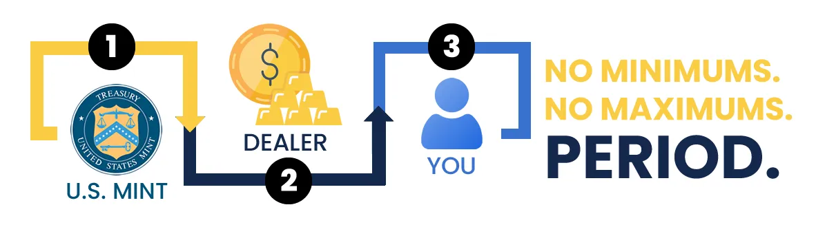 We've cut out the middleman to deliver the best prices on gold and silver bullion—no gimmicks, no hassle. With no minimums or maximums, you have the freedom to invest on your terms, whenever and however you choose.